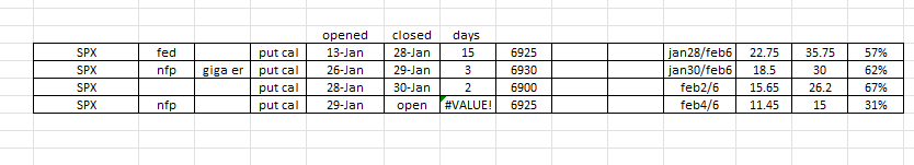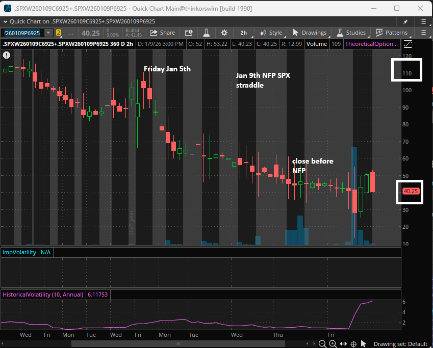 Here is a chart of the 6925 Jan 9th payrolls straddle as it was whittled down from $110 the Friday before to $43 the night before the report: