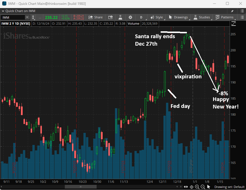 Well, that round strike at $200 and associated gamma probably had something to do with this, but looking at ETF performances on Fed day last December, the small cap 3x ETF TNA, and the 3x XBI ETF LABU, which is loaded with small caps, did phenomenally well. Gold, pot and regional banks spiked as well; enjoy digging through this chart, there’s probably something for everyone in here:
